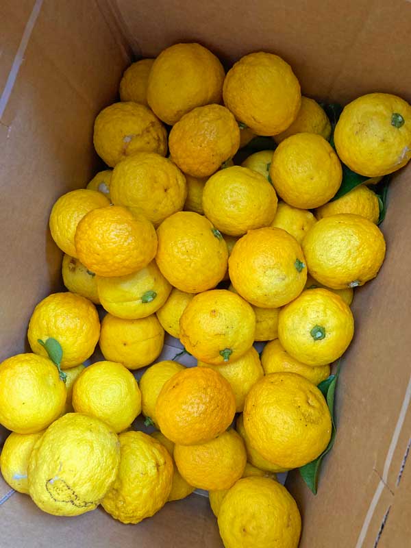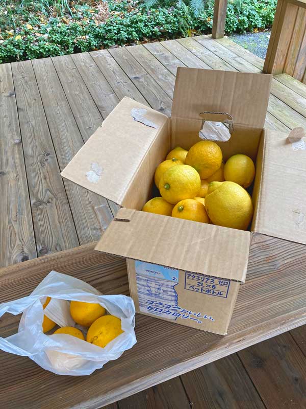 届けて下さったのは、地元で先祖代々の畑を守っていらっしゃる I さん。「レモンを買っているなんて、それもあんな高い値段で、あのレモン作っているのは親戚ですよ」と言いながら段ボールをテラスに置きました。