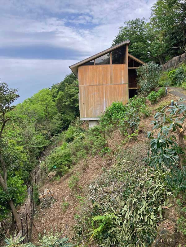 2階のテラスから見ると、地上で必死に草刈りをしている職人さんが小さく見えます。