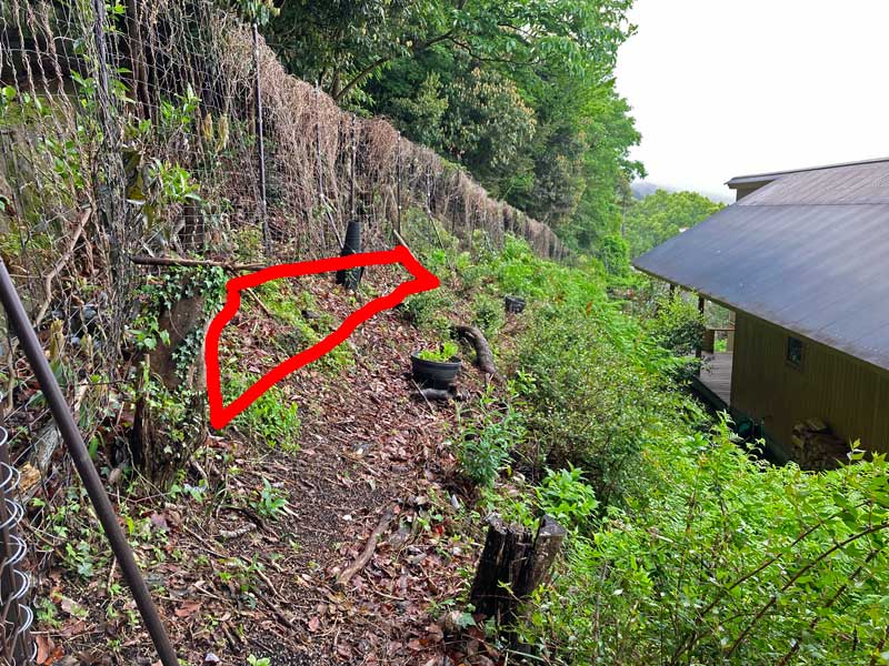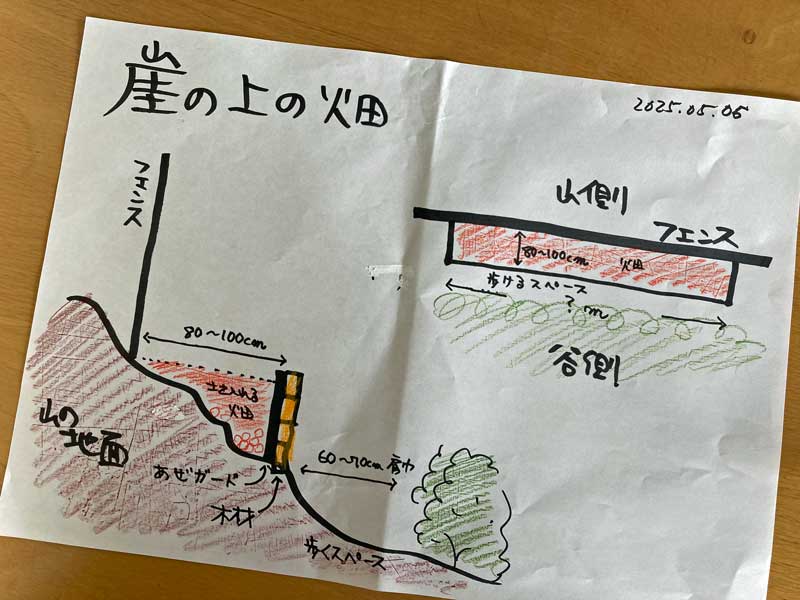 北斜面の我が敷地の一番上、つまり南側、鹿猪除けフェンスに沿った、この部分に畑を作る日です。