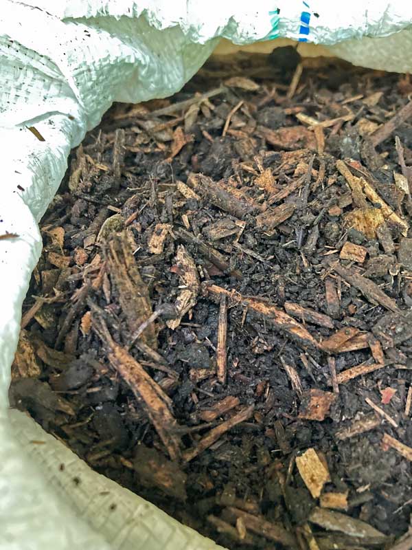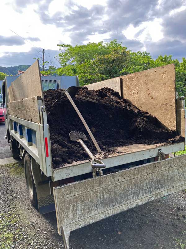 造園屋さん自家製の腐葉土は、前日の雨で濡れて重たそう・・・