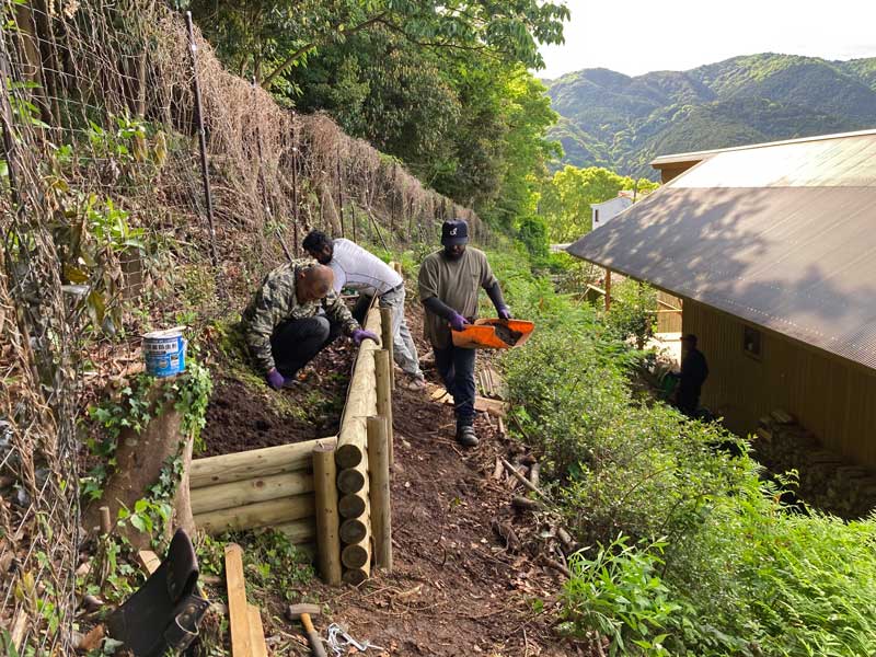 土留めを作る場所は急勾配、しかも水平方向にも高低差があるので、丸太を積むのは簡単ではありません。