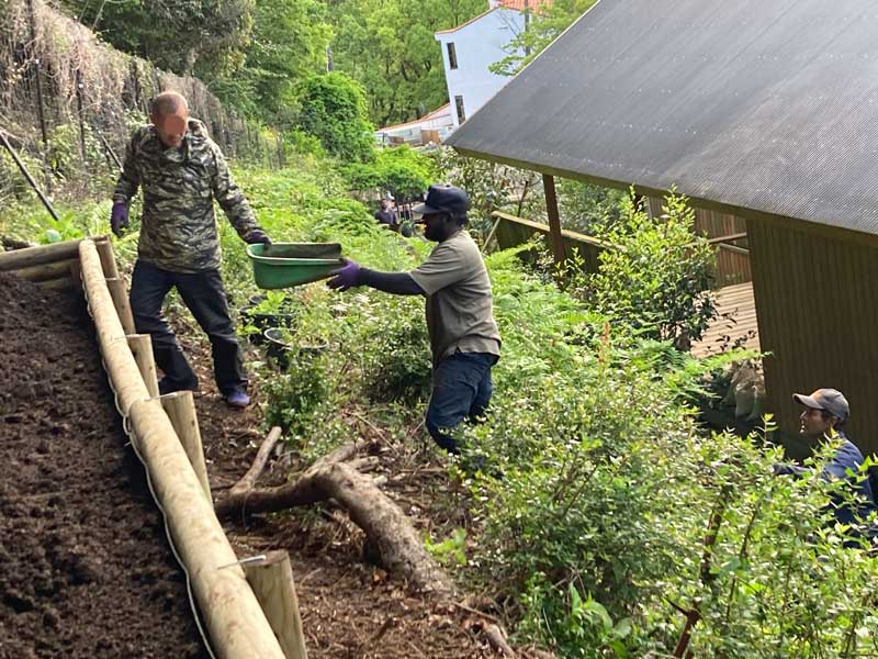 出来上がった部分に用土を入れるのが始まり、出来上がっていない部分の丸太積みも続いています。