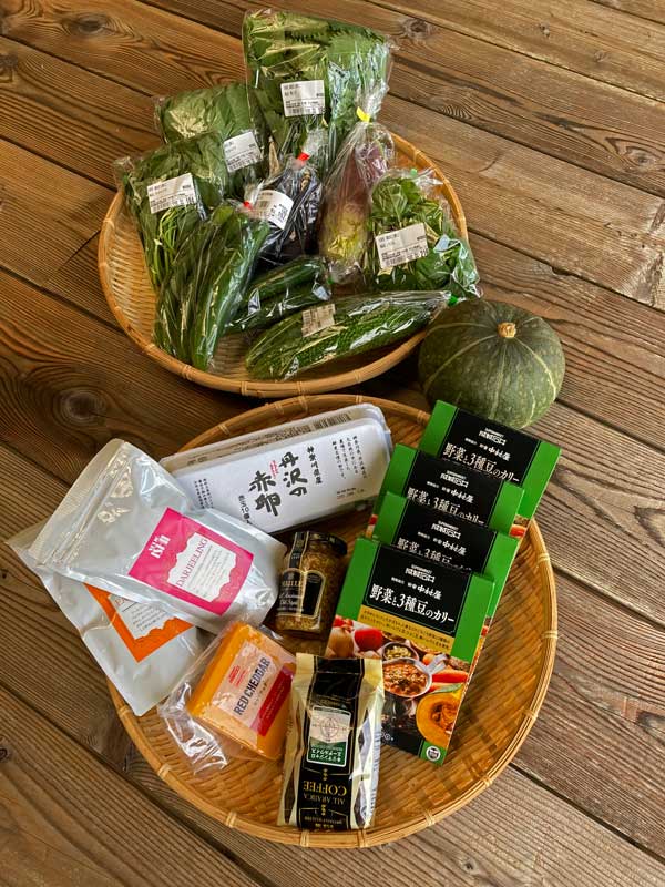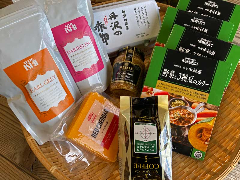 毎朝の紅茶2種類、お客様用のコーヒー豆、日本的な味の豆カレーのレトルト、粒マスタード、チーズと卵。私はビーガンなのですが、3回骨折してからチーズと卵を食べる努力中です。
