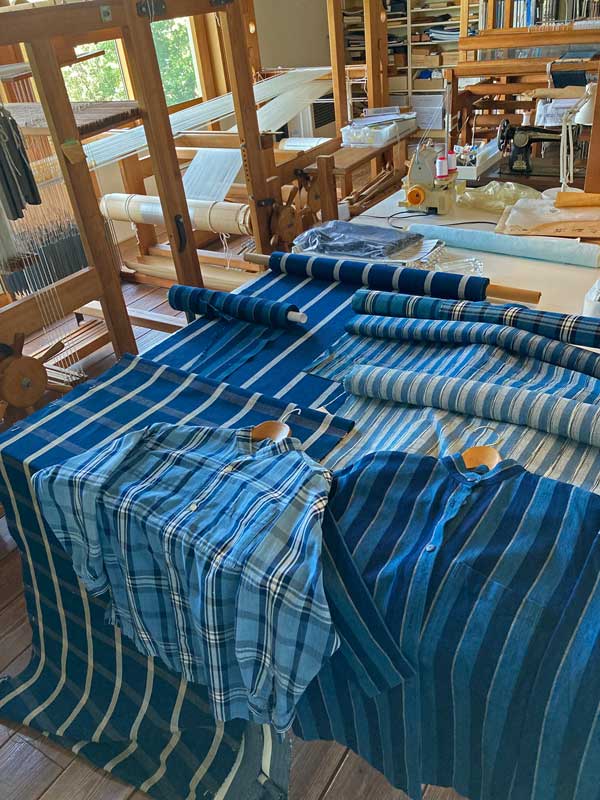 織った布と過去のサンプルを並べて、毎日眺めながら考えています。