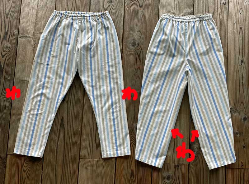 脇がわの「うなぎの寝床」さんのは、股が外側に拡がり易く、内側がわの森南海さんのは股が内側に窄まり易いのが分かりました。生地は布目の方向に流れ易いようです。