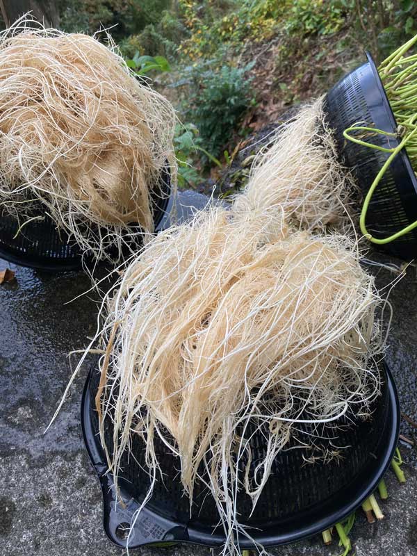 根を切って、ザルに敷いた不織布を思いきり引っ張って、やっとこさっとこ根や茎をザルから外しました。