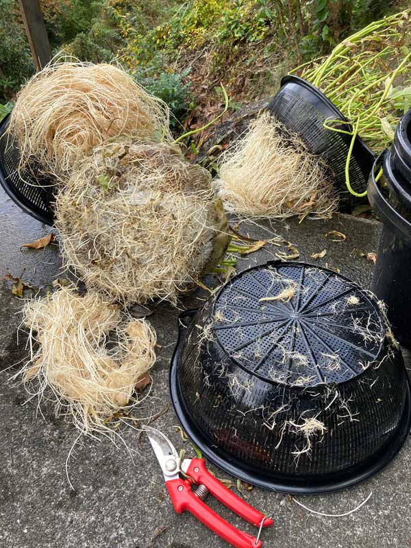夏に大活躍したザル栽培の空芯菜ですが、9月半ばから太陽が射さなくなって成長が止まってしまいました。この時期敷地内に太陽が当たる場所は無く、後始末することに、11月7日のことです。
