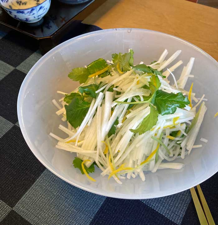 千切り大根、三つ葉、柚子を合わせただけでドレッシングはかけずに冷蔵してあったので、これをお澄ましでサッと煮ればお雑煮になります。