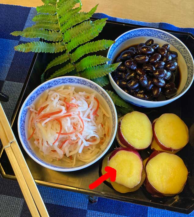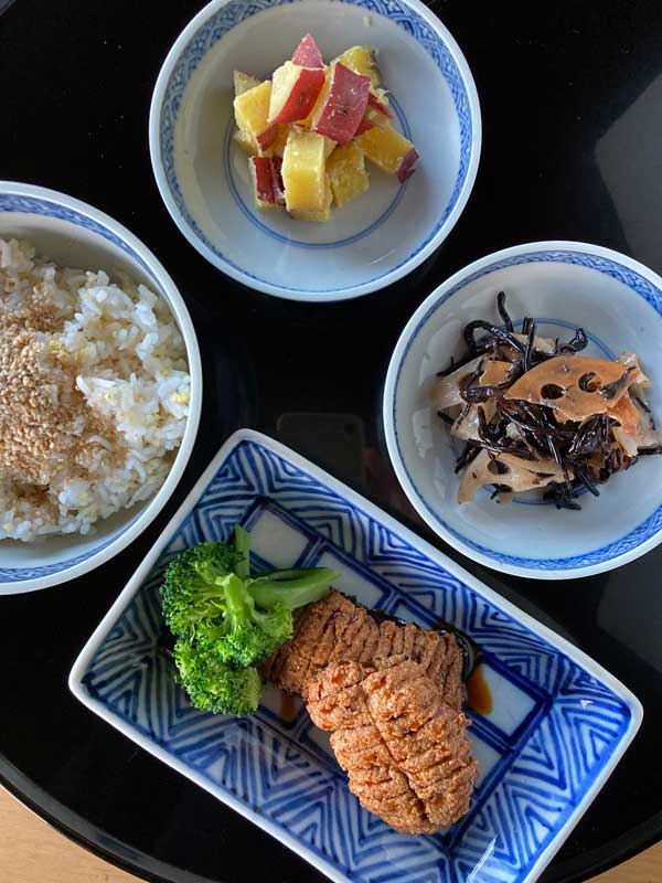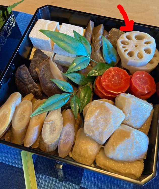 この日は、上記の千切り大根に油揚げと煮物の人参をお澄ましで煮たお雑煮。それにビーガンの伊達巻とお煮〆の残りにしました。