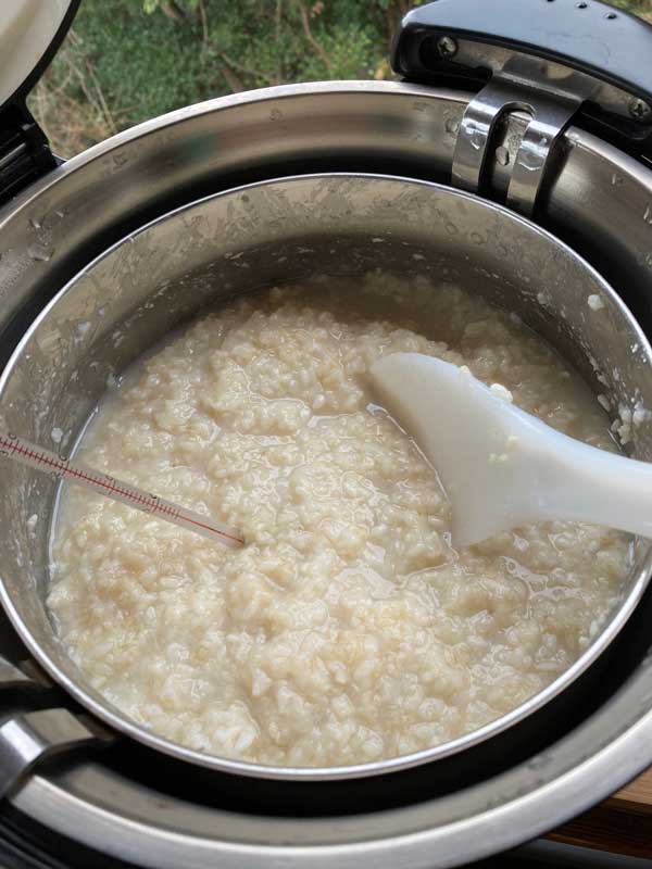 出来上がったこの甘酒は「甘酒の元」で、水で薄めて甘酒として、甘味料としてそのままお菓子や味付けに使える濃い甘酒です。