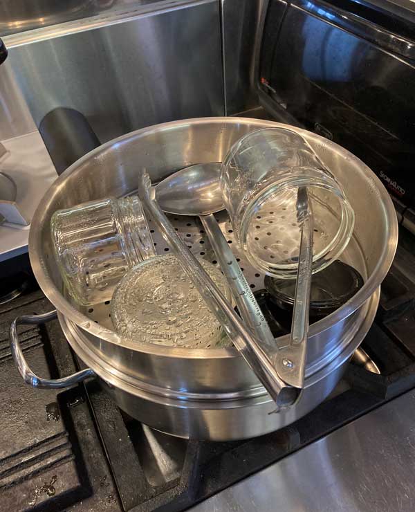 出来た甘酒を入れる容器を消毒します。今回は蒸し器で数分蒸しましたが、アルコール消毒でもOK。