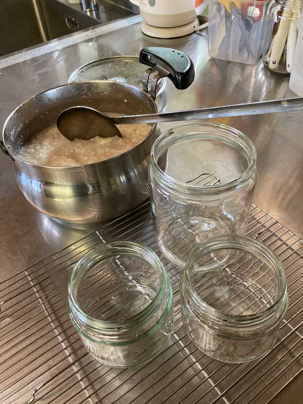 蒸気で消毒した容器が冷えたら、出来上がった甘酒を入れます。