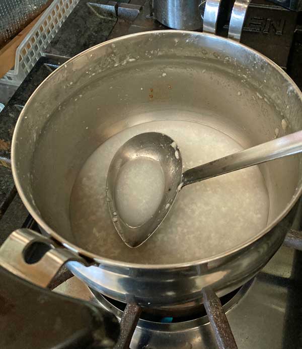 鍋に残った甘酒に適量の水を入れて温めれば、甘酒の出来上がり。