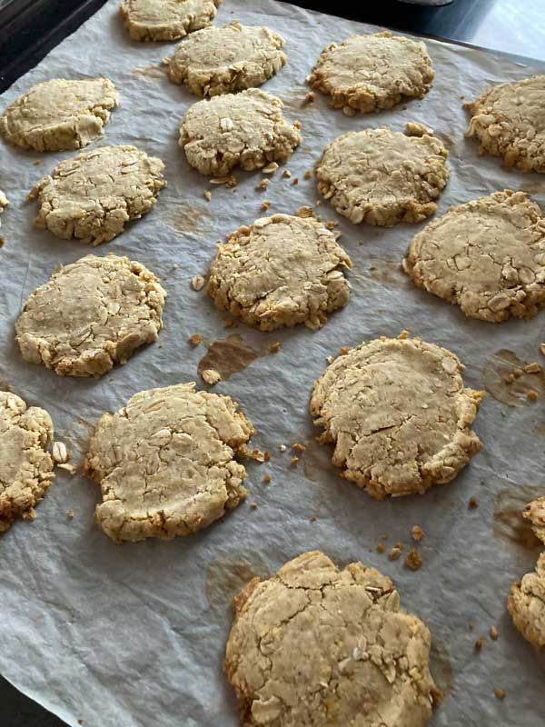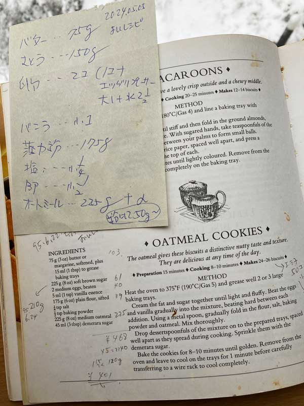 このオートミールクッキーはイギリスのレシピでかなり甘いので、砂糖は半分に、卵はEgg Replacerに置き換えました。
