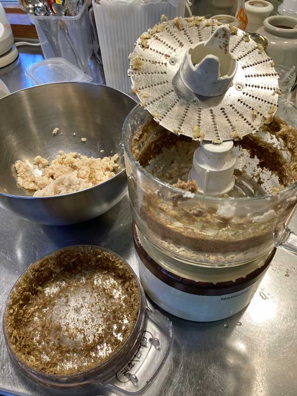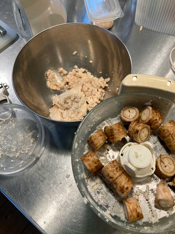 すれた牛蒡を蓮根の入ったボールに移し、フードプロセッサーの摺りお下ろし部品を外し、普通のブレイドに交換しておきます。