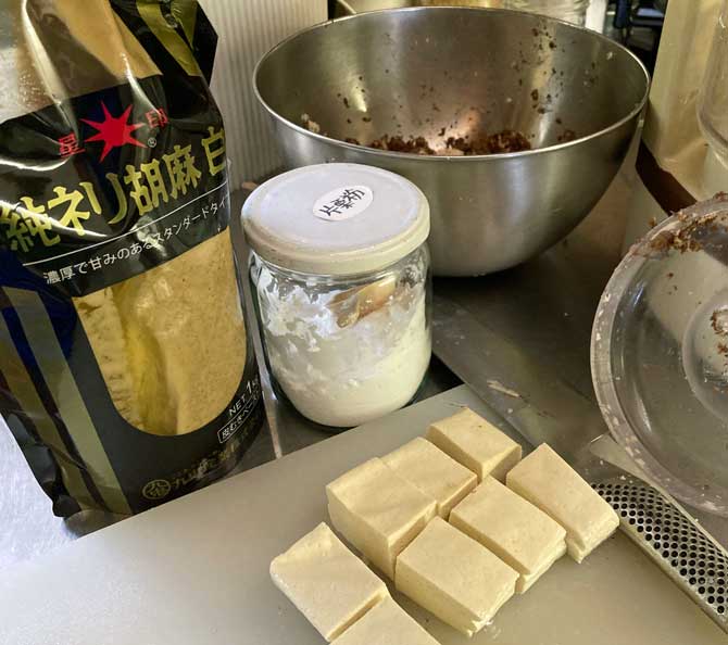 ②豆腐・片栗粉・練り胡麻・塩を、すり鉢かフードプロセッサーでペースト状にする。