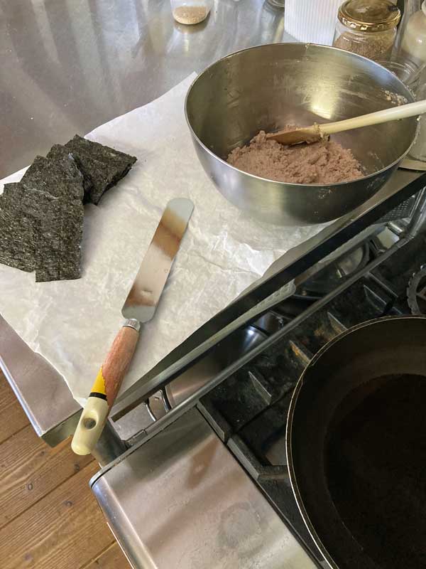 鰻もどきの種を海苔にのせると、海苔が水分柔らかくなり扱いにくくなるので、作業は手早く行います。