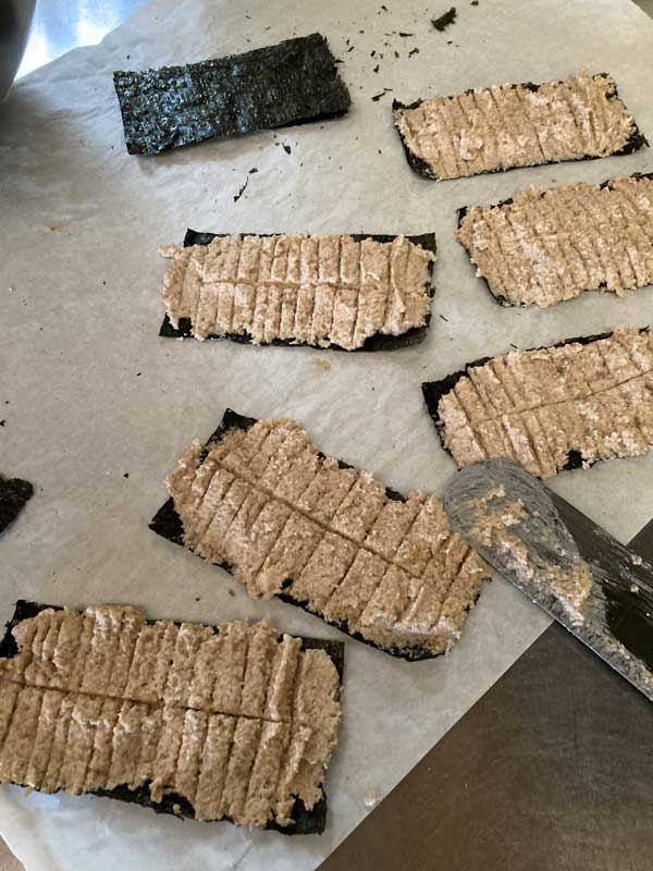 海苔に鰻の種を乗せて、鰻もどき一切れを作り始めます。