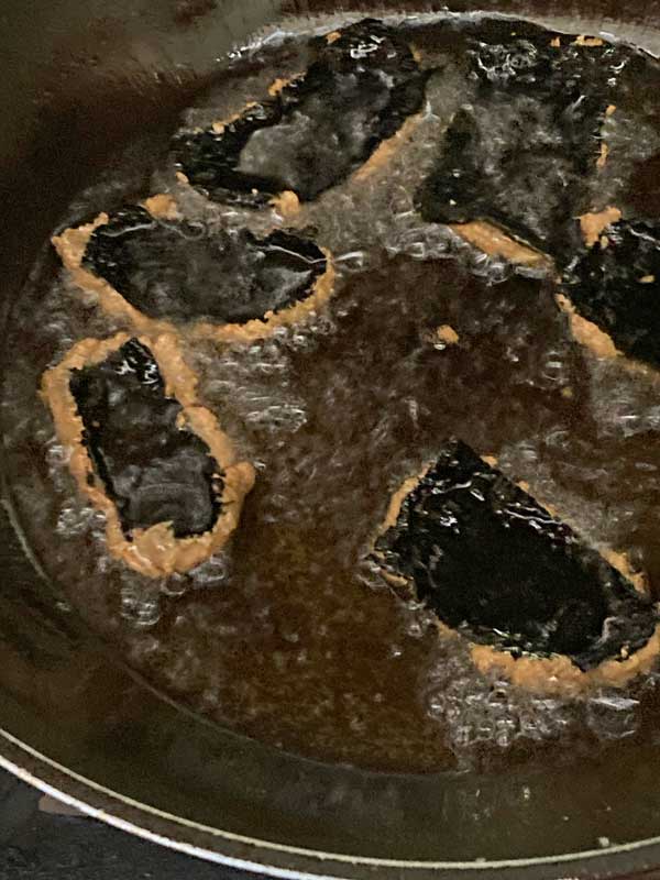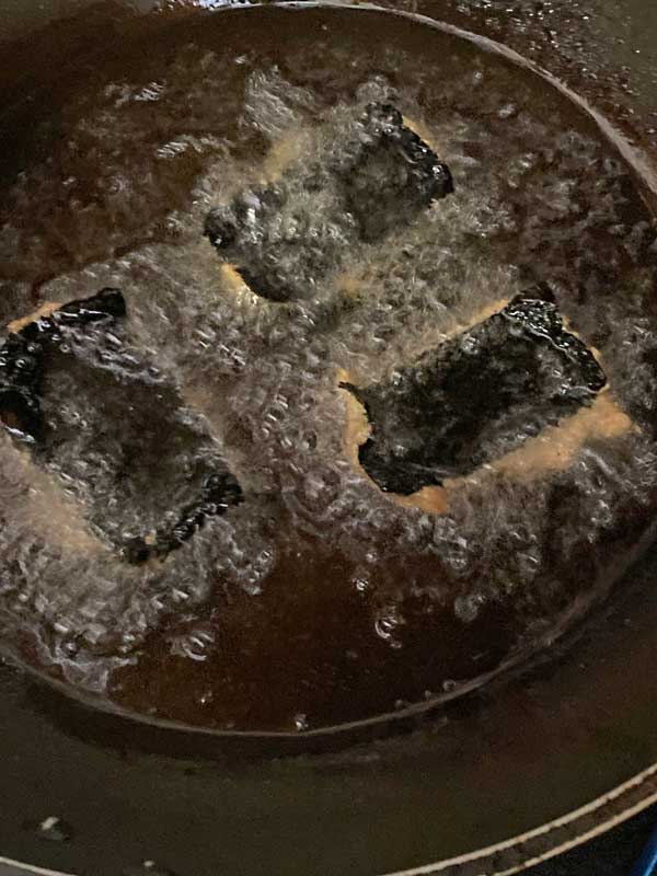 170度くらいに熱した揚げ油に、海苔を上にして入れます。海苔が破れないよう手早く丁寧にが大切!