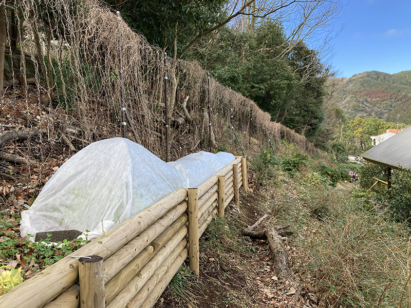 崖の上の畑は不織布のトンネルを被って静かです。