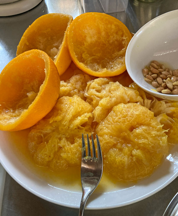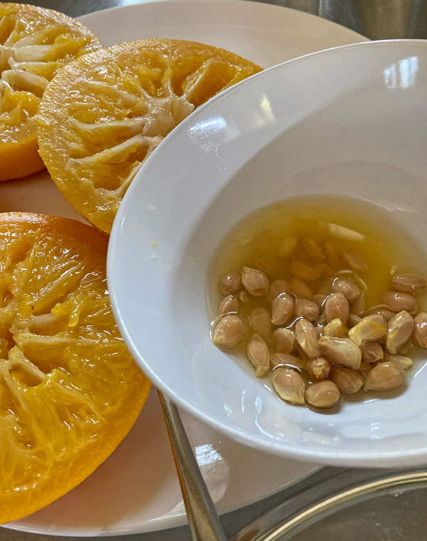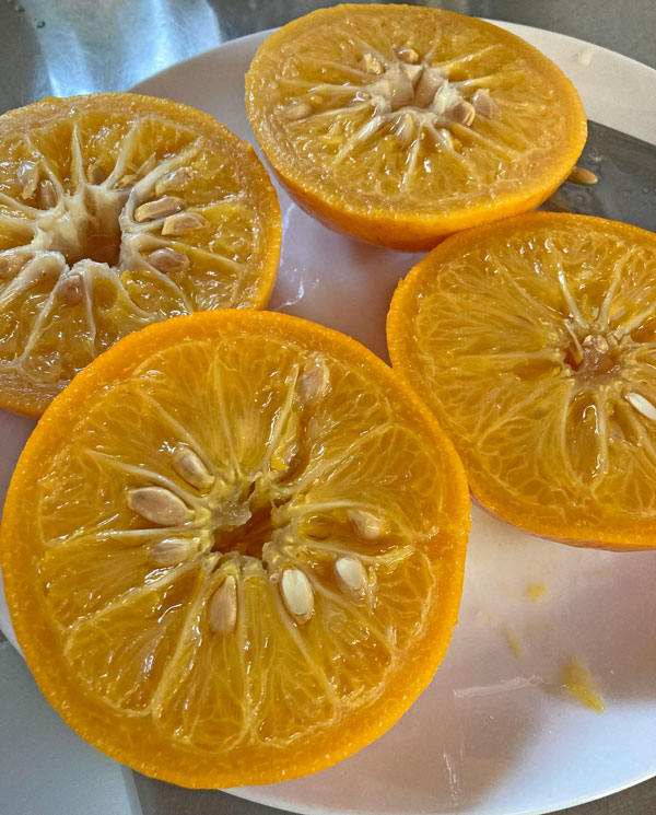 一晩ゆで汁ごと放置したミカンを皿に取り出し、横に2つに切ります。