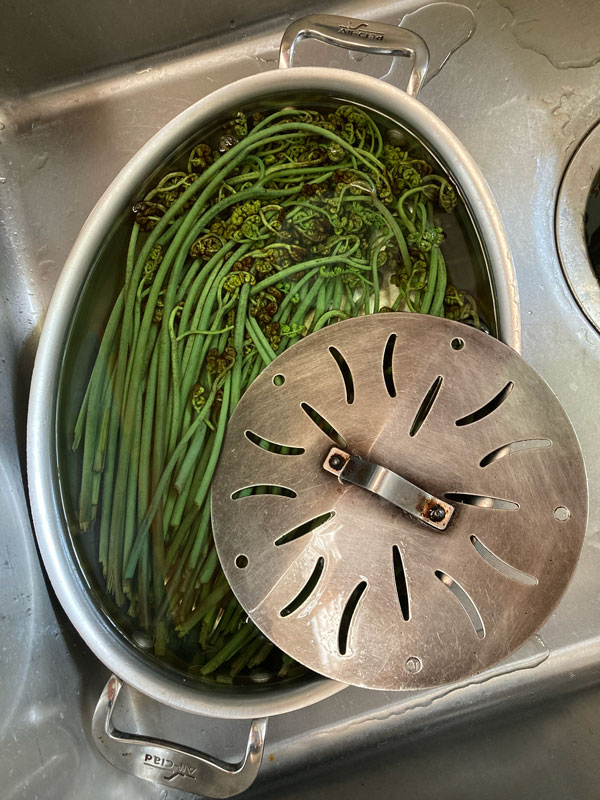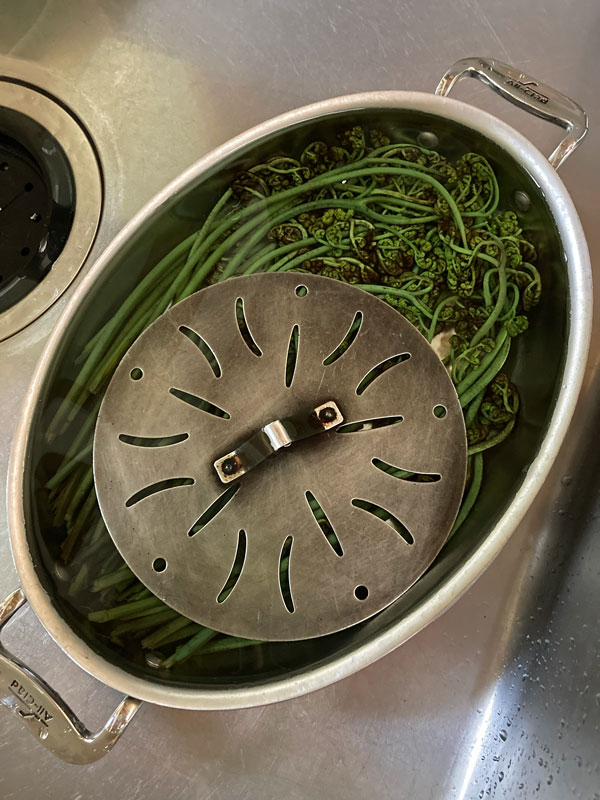 崖から落ちないように気を付けてワラビを採り、キッチンに直行。