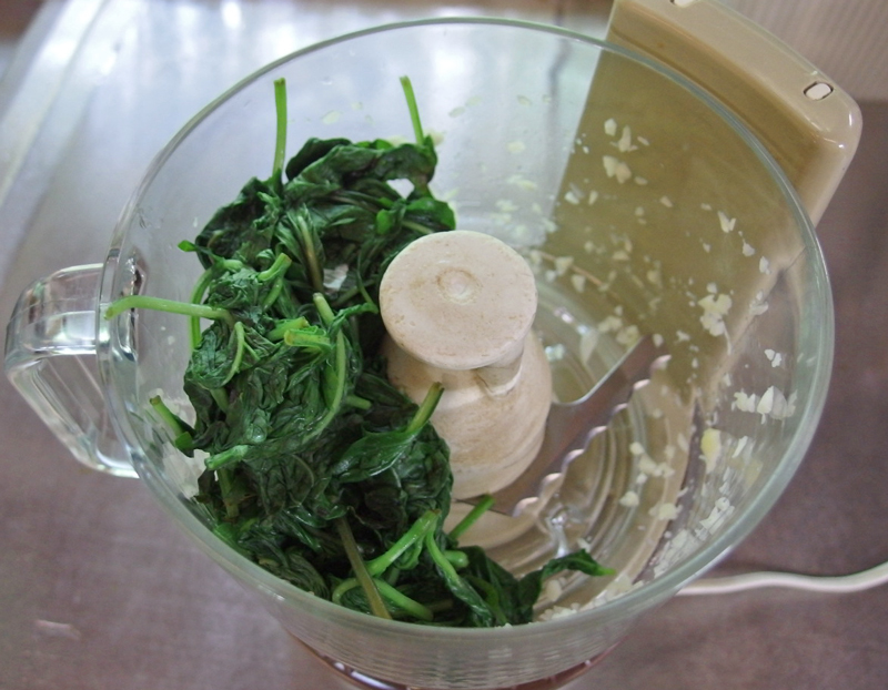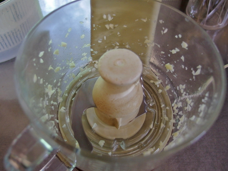材料に対してフードプロセッサーが小さめの時や、パワーが足りない時は、材料を一度に入れないで順番に少しずつ入れると上手にプロセスできます。 先ずニンニクを入れ、