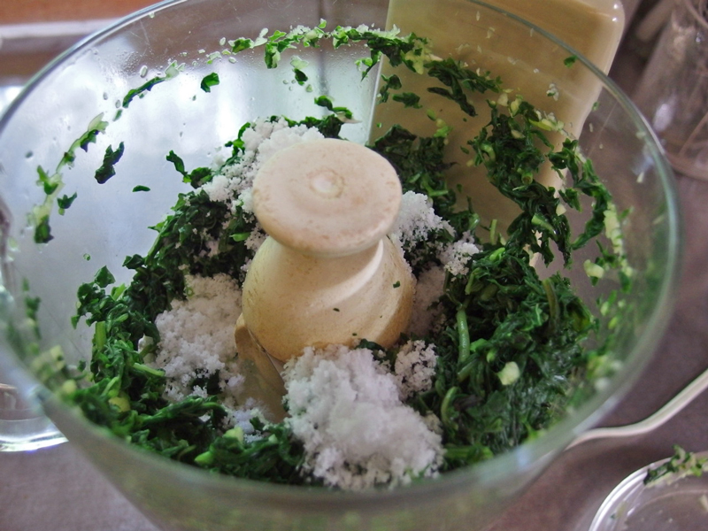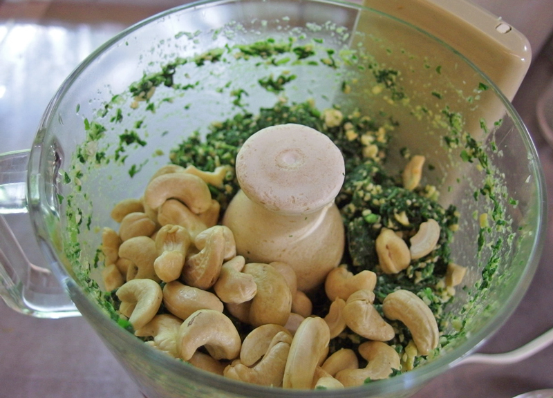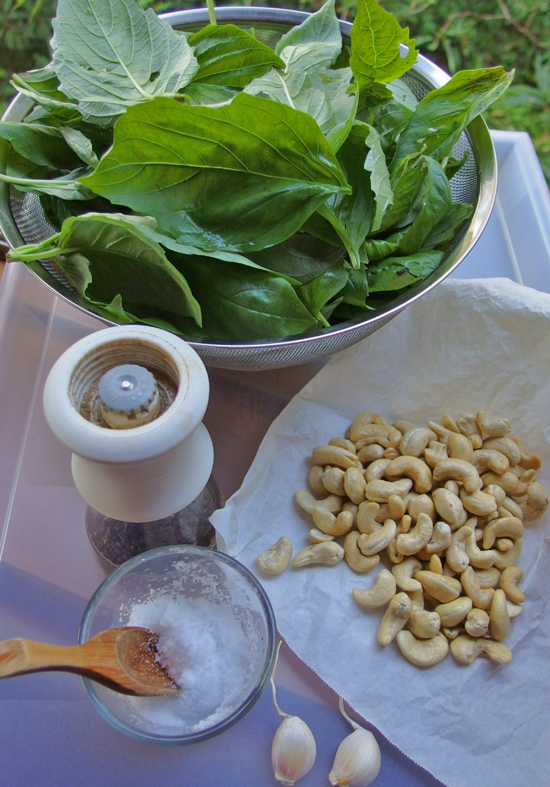 材料は、バージル、カシューナッツ、にんにく、それに塩と胡椒。 ナッツは本当は松の実を使うのですが、近年松の実が高騰し、オーガニックのものは手の届かない値段になってしまったので、最近はカシューナッツで作っています。