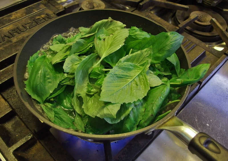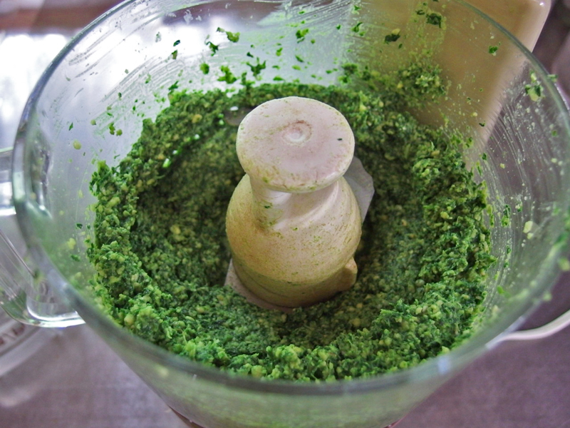自家製のバージル・ペーストは香りと色が素晴らしいので、頑張って手作りする甲斐がある、そんな保存食品です。私のはチーズを使わないビーガンバージョン。それに保存中の色や味の変化を少なくするために、バージルはサッと熱湯を通し、オイルも加えないものです。