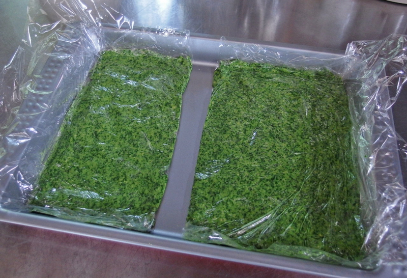 ④ 出来たペーストを広げたラップの上にのばし、ラップを折り返してはさんで凍らせます。凍ったらジップロックに入れて冷凍保存し、必要なだけ凍ったまま割って使います。 → オイルやチーズはパスタと和える時に加えます。