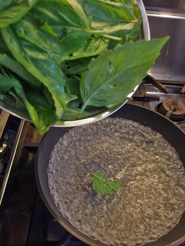 鍋に塩を入れた湯をわかし、そこへバージルの葉をいれます。