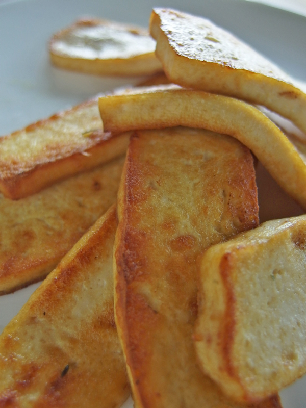 お豆腐をニュートリショナルイースト、スパイス、お醤油に漬けこんでから焼いた、まるで鶏のささみのようなお豆腐のソテー。