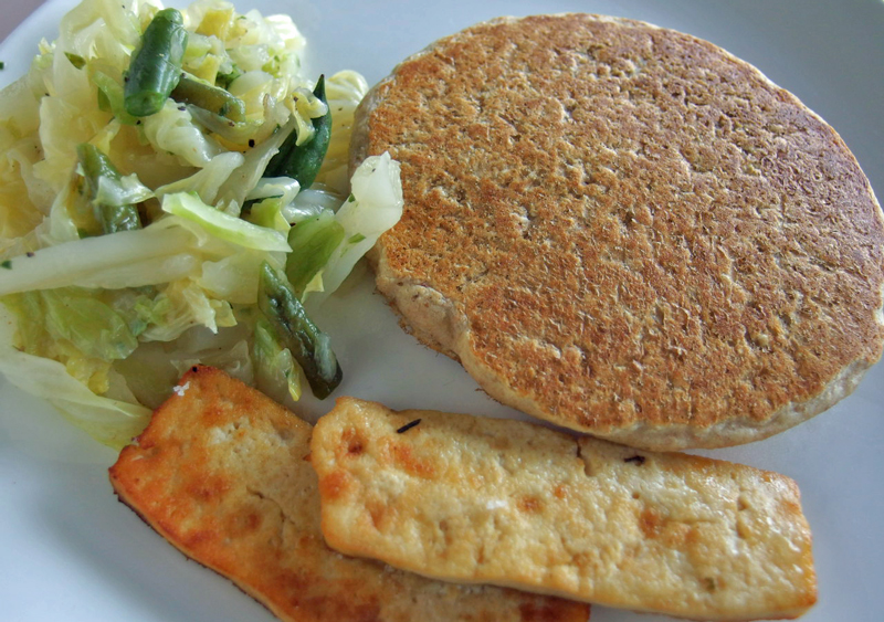 このパンケーキを、ソーセージ代わりのチキン味のお豆腐のソテーと、キャベツとインゲンの蒸し煮と一緒に食べます。