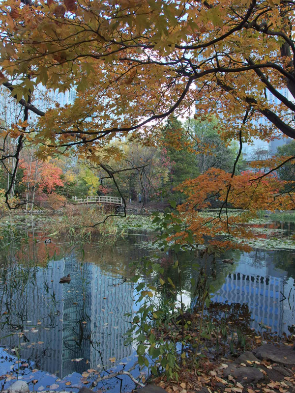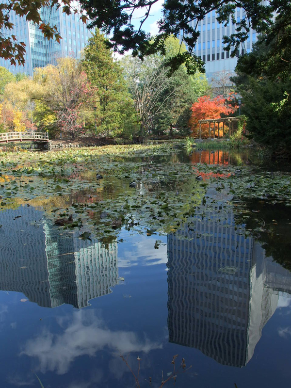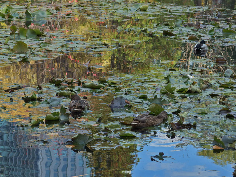 池に茂る蓮の葉で分断された、鏡になった水面に映る景色、水面を行く鴨でその景色は揺らぎ、見つめていると何を見ているのか分らなくなります。幻想を見ているよう。