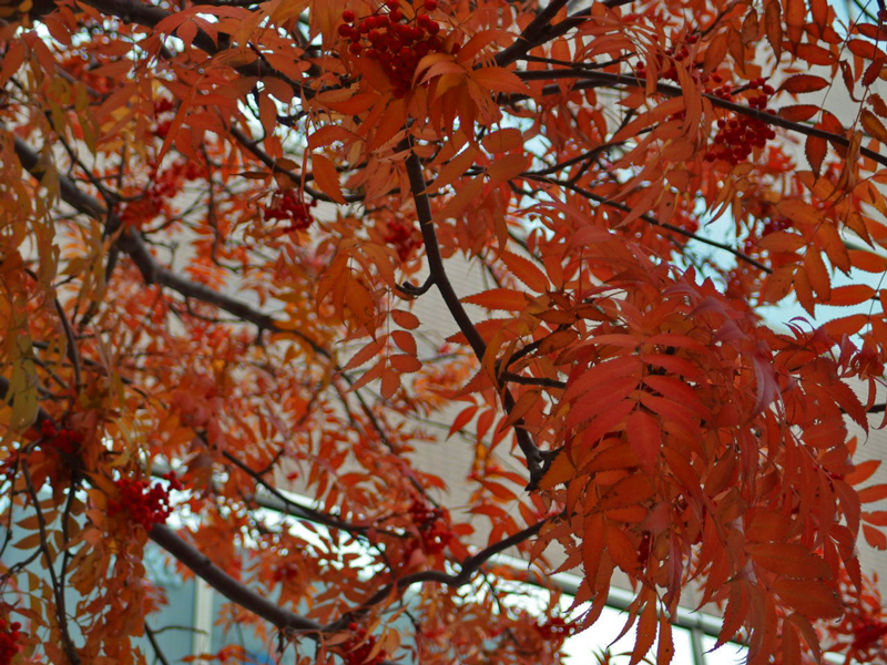 ホテルの側の歩道の並木、伊豆にはない紅葉の色。