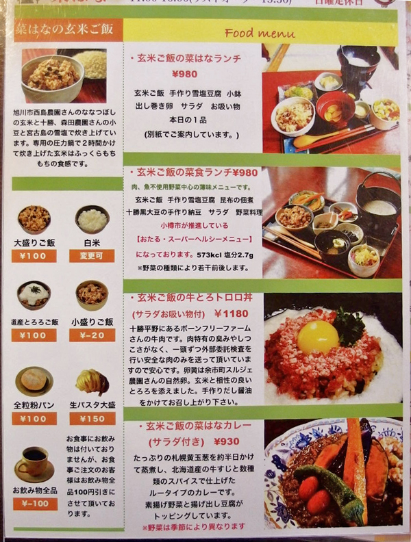 写真入りの分りやすいメニューがテーブルに置いてあります。玄米ご飯は、旭川産の「ななつぼし」というお米で、圧力鍋で2時間炊いたものとのこと。