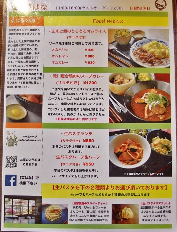 余市町で平飼いされた鶏の卵のオムライスもあります。鶏の資料は地元の天然ものです。滝川産の合鴨のスープカレー、生パスタまであります。