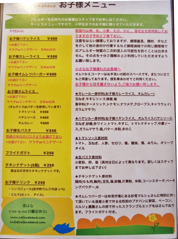 畳の古いお座敷に色々なテーブルと椅子に座布団、古い家具、ピアノ、オモチャ、色々な飾り物、小さな展示をするコーナー、台所から流れてくるお料理のにおい、、、 何となく雑然としているのですが、お料理はしっかり本物で、メニューも子供から大人まで、男性にも魅力があるものです。地元の産物を美味しく食べて頂こうという情熱と、そして何より明日を創る子供たちへの愛と配慮がお店の中に漂っているのです。楽しそうに食事する子連れの家族に囲まれて、私達までポカポカ幸せになれたお昼ご飯でした。