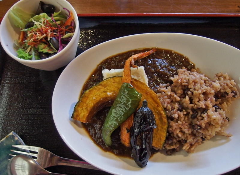 私は勿論 菜食ランチ を注文。 すると今日はもう終わってしまったとのお返事。がっかりして他に食べられそうなものがないかメニューを見なおしていると、配膳の方がキッチンへ相談に行って下さいました。菜食ランチの手作り納豆が終わってしまっただけなので、それを他のものに、例えば「梅干」でよければ作れますとの事。勿論それでOK。お友達はオムカレーを注文。しばらくしてお料理が運ばれて来ました。