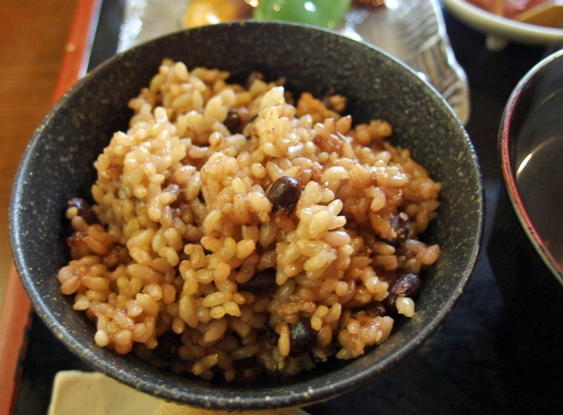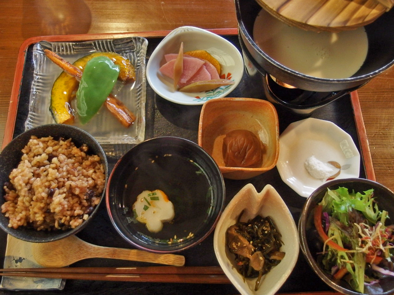 小豆入り玄米ご飯、手作り豆腐(雪のような細かい塩を振っていただきます)、自家製昆布の佃煮、揚げ野菜の葛かけ、サラダ(揚げた人参や黒豆入り、玉ねぎドレッシングが別添えで)、香の物、すまし汁、そして大きな梅干。