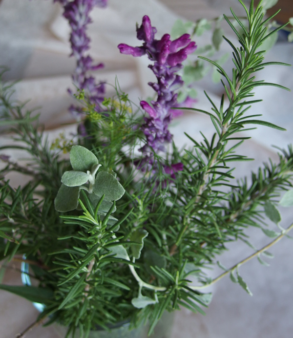 テーブルに着いただけでリラックスできるセッティングを考える機会がありました。どんな色や香りがよいのか、、、 どんなふうにそれをセッティングすればよいのか、、、悩んでいないで試してみようと、下の畑にハーブを採りに行きました。元気なのはローズマリーだけ、後はアメジストセージととフェンネルの花が少しだけ残っていました。