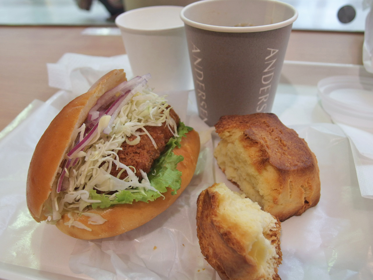 北海道のじゃが芋コロッケのサンドとスコーンの遅いブランチを食べて帰途につきました。