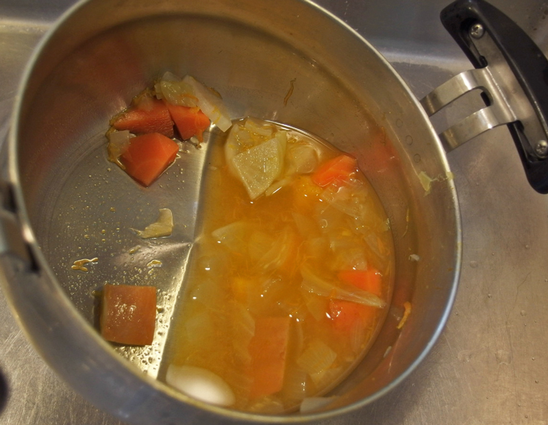 鍋一杯に作って二人で4回ほどいただいて、残った甘い野菜のスープ。一人分くらいしかないので、そんな時は・・・