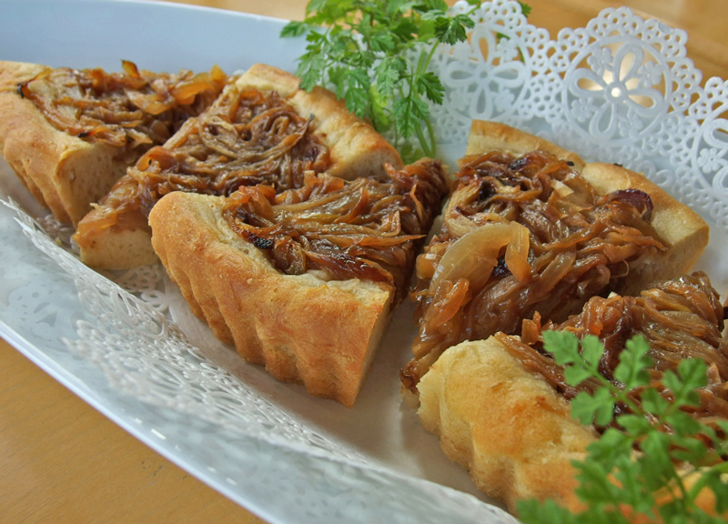 前菜のピサラディエール、フランス風玉ねぎのピツァです。前日玉ねぎを炒め煮している時電話が入って焦がしてしまい、白く仕上げる玉ねぎが茶色くなってしまいました。