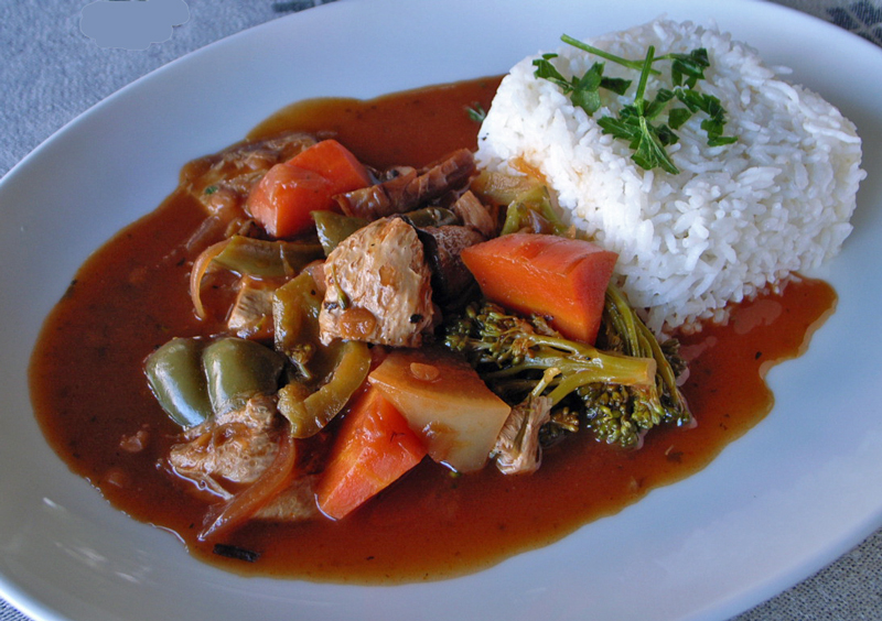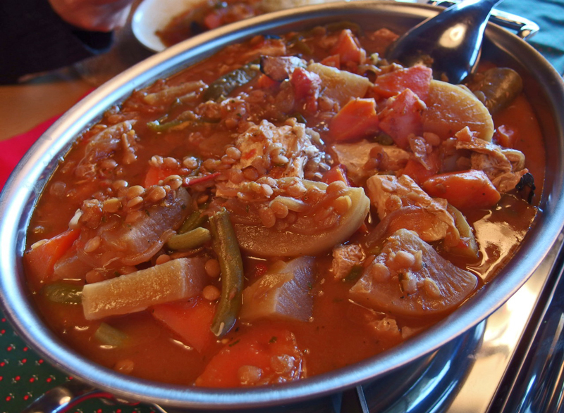 メインは肉を使わないベジタリアンシチュー、肉の代わりに小麦タンパクで作ったグルテンミートを使っています。付け合わせは五分づき米とバスマティ・ライスそれにキビの入ったご飯です。