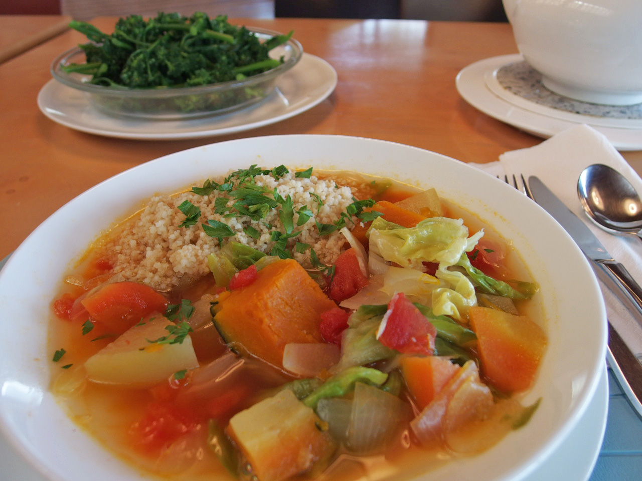 こんな風に急いでいる日は、またスープです。 先日作ったホッとスープを鍋ごと冷蔵庫に入れてあったのが残っています。 ご飯は切れているけれど、クスクスを入れればモロッコ風に。