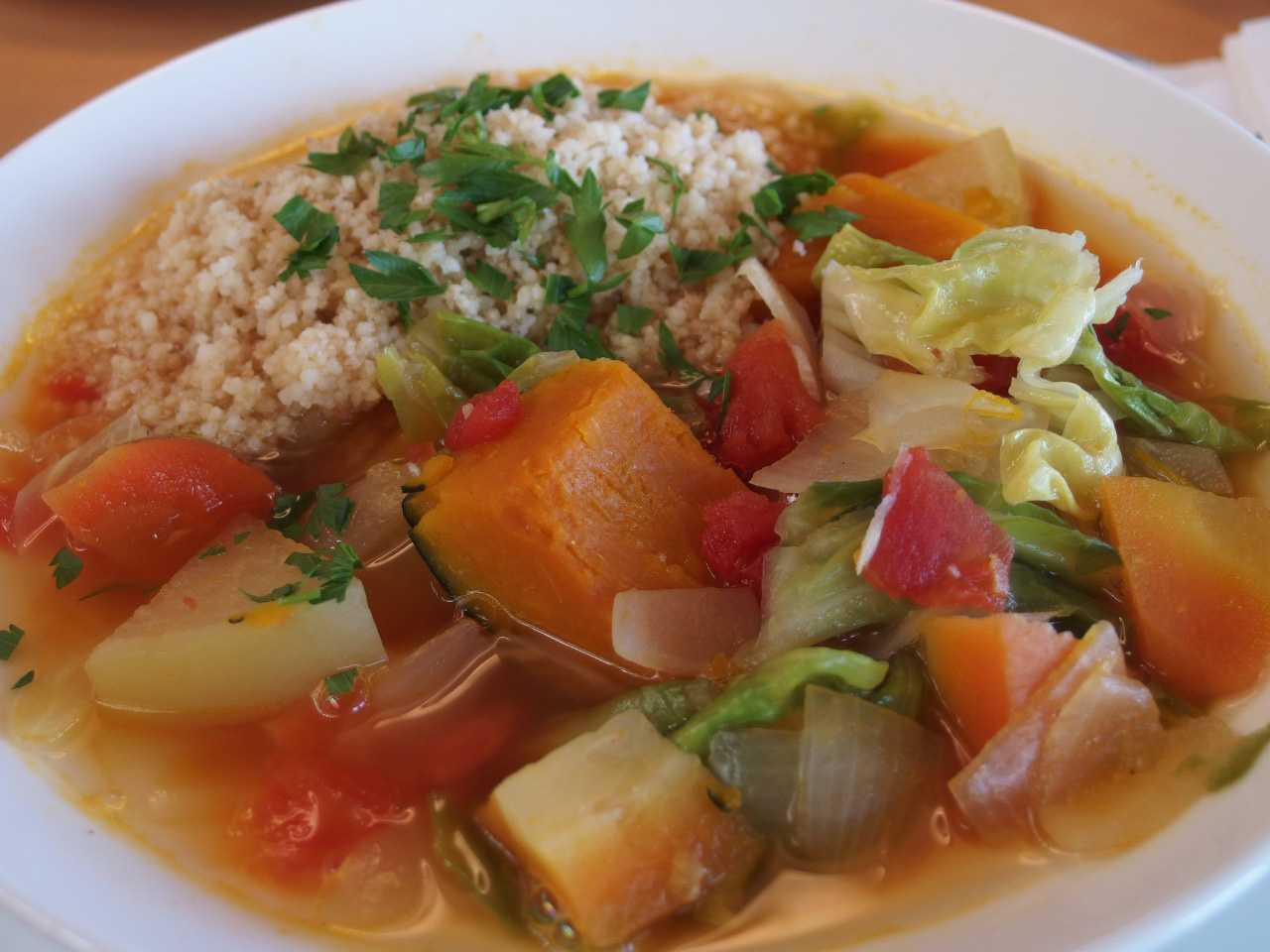 ホッとスープにクスクスを添え、採れたてのイタリアンパセリを散らしました