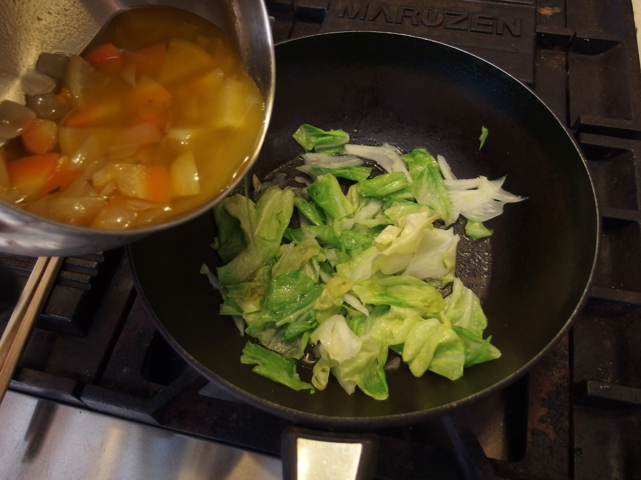 冷蔵庫にあったホッとスープの残りを入れます
