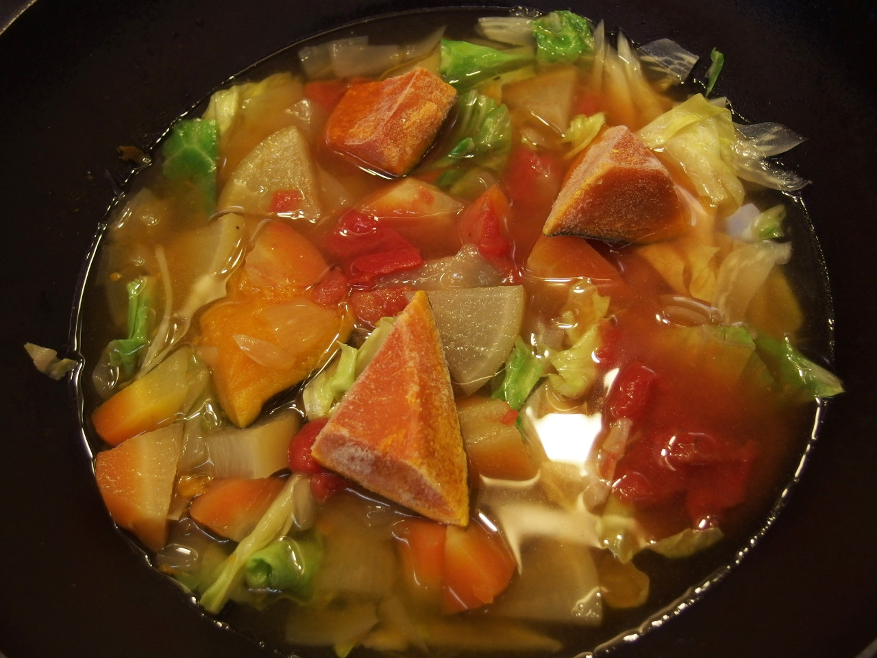 トマトの水煮缶(ダイス)を少し入れ、水を足して温め、塩胡椒で味を調えます