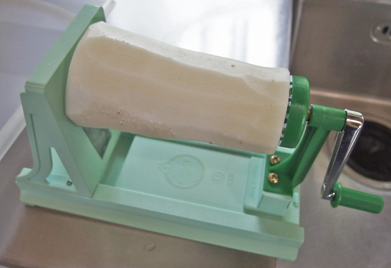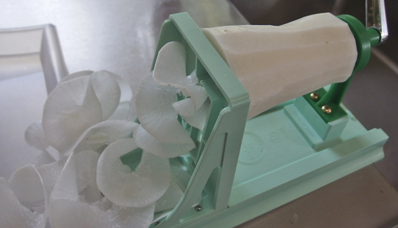 これはお刺身のつまを作るスライサーで、千切りにする刃を外すと、このようにリボン状に切れます。